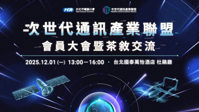 本會謹訂於 2025年12月1日(星期一)舉辦「臺灣次世代通訊產業聯盟會員大會曁茶叙交流」,邀集本聯盟的企業及個人會員參與,除了凝聚聯盟共識,期待在茶敘中,促進會員彼此認識、交流。誠摯邀請會員共襄盛舉,見證聯盟正式啟動的重要時刻。
